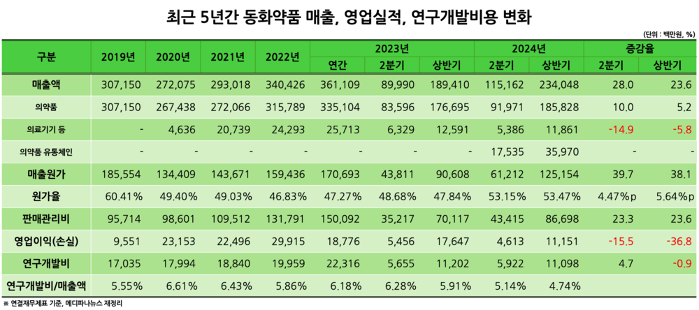 다만 중선 파마 인수에 따른 후속비용 지출, 매출원가 및 판관비 확대 등은 수익성 악화에 영향을 미쳤다. 올해 상반기 매출원가는 1252억원으로 전년 동기 906억원 대비 38.1% 증가했으며, 같은 기간 매출원가율은 47.84%에서 53.47%로 5.64%p 상승했다. 판관비는 전년 동기701억원 대비 23.6% 증가한 867억원을 기록했다.