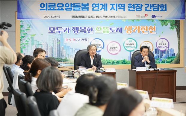 정기석 국민건강보험공단 이사장은 28일 보건복지부가 총괄하고 공단이 운영하고 있는 '노인 의료‧돌봄 통합지원 시범사업' 진천군 현장을 방문해 사업담당자들과 간담회를 가졌다.