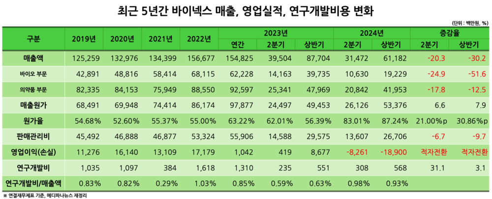 바이넥스가 올해 상반기 적자전환한 것은 전체 매출이 감소한 영향이 크다. 올해 상반기 바이넥스는 연결재무제표 기준 매출 612억원을 기록했다. 이는 전년 동기 877억원 대비 30.2% 감소한 수치로, 특히 바이오 부문 실적이 부진했던 영향이 크다.