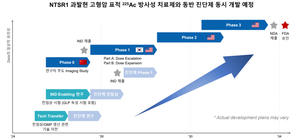 최 본부장은 후보물질 개발 계획과 관련해 "액티늄(방사성 동위원소) 기반으로, 진단제도 동시에 개발해서 원활하게 활용되도록 할 계획"이라면서 "임상 1상 전에 내년 하반기 중국에서 연구자 주도 임상을 진행할 예정이며, 임상 1상은 내년 말에 진입 일정"이라고 말했다.