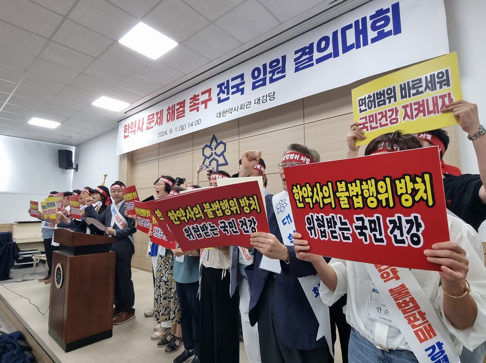 대한약사회 회장단, 상임이사, 정책기획단과 시도지부 지부장과 부지부장, 상임이사, 분회장 등 전국 각 지부 약사회 임원 332명이 1일 서울시 서초구 대한약사회관 대강당에 집결해 '한약사 문제 해결 촉구 전국 임원 결의대회'를 개최하고 한약사 문제 해결을 위해 한 목소리를 냈다.