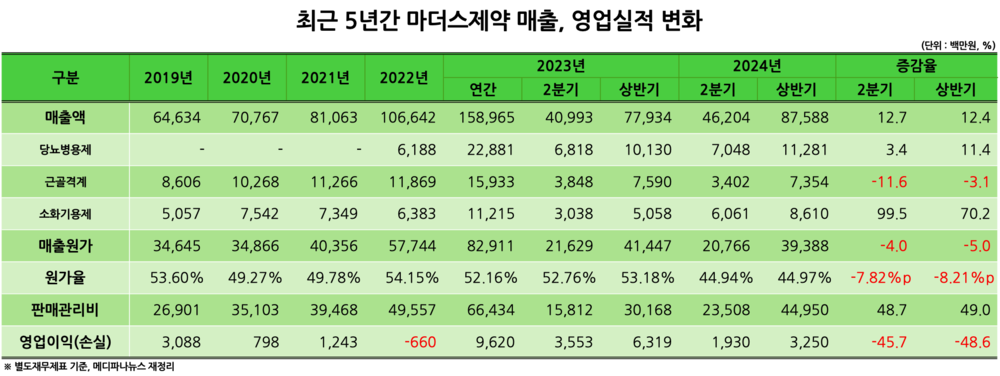 마더스제약은 2018년 매출 431억원을 기록한 뒤 연평균 성장률 25%로 외형 성장을 지속해 2022년 1066억원으로 '첫 매출 1000억원'을 달성했다. 이어 2023년에는 매출 1590억원으로 직전년도 대비 49.1% 성장하는 모습을 보였다.