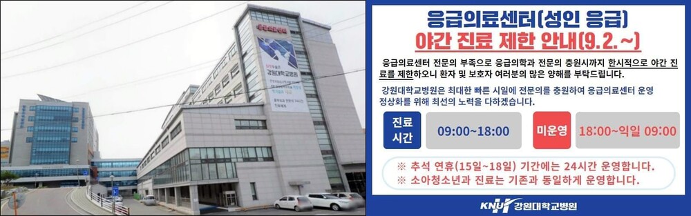 세종충남대병원은 9월 한달 동안 야간 응급실(성인응급) 진료를 제한다고 밝혔다. 다만 추석연휴기간인 9월 16일부터 18일까지는 24시간 운영한다. 강원대병원는 전문의 부족으로 추석연휴기간인 15일부터 18일까지를 제외하고 인력 충원이 될 때까지 무기한 야간 응급실 진료를 제한한다.