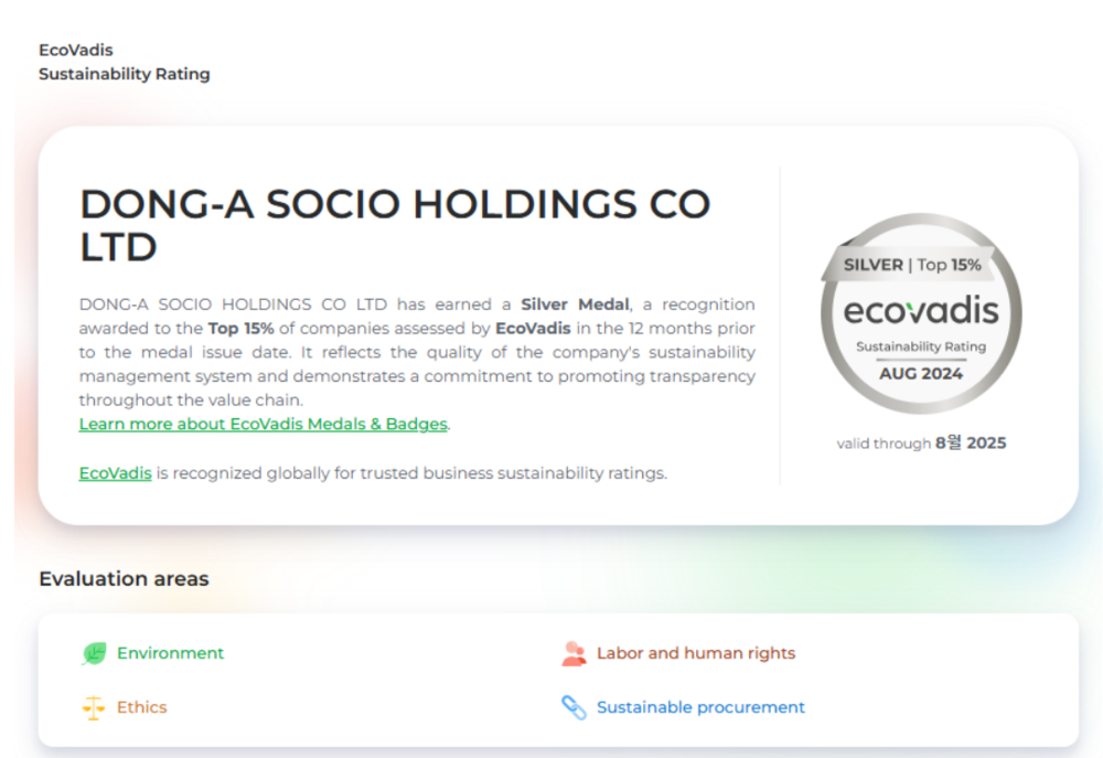 동아쏘시오홀딩스는 노동 및 인권, 윤리, 환경 분야 순으로 우수한 점수를 받아, 첫 평가에서 상위 15%에 해당하는 실버 등급을 받았다.