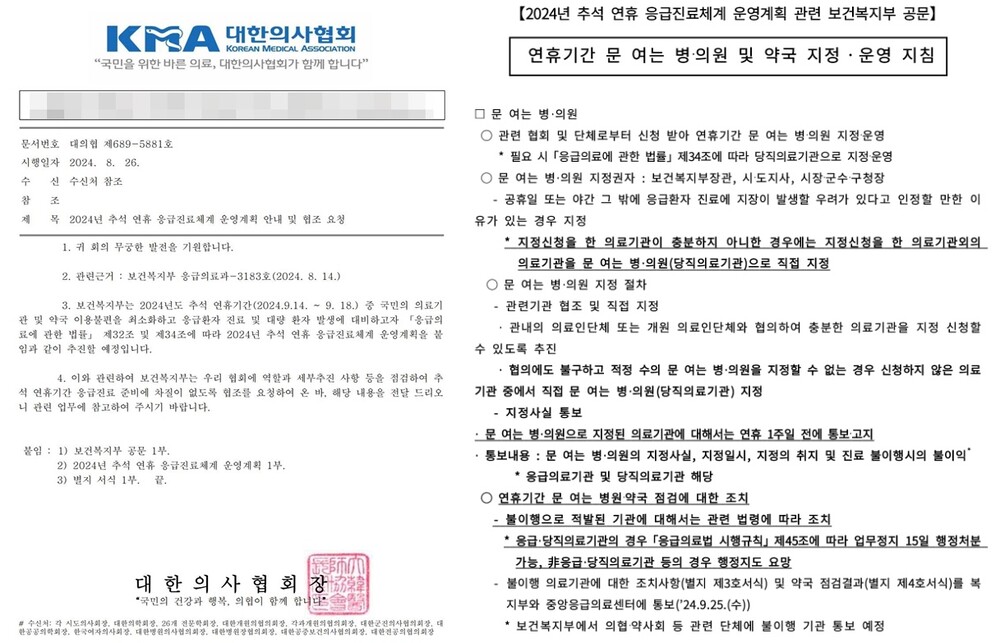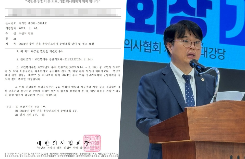 채동영 의협 공보이사는 "연휴마다 나오는 공문인 만큼 사실관계 전달은 드려야 하니 협조요청 공문을 발송한 것"이라며 "(임현택 회장)단식 등 시점을 복합적으로 고려했고, 정부도 자꾸 추석 응급실 문제가 없을 거라고 하는 등 태도도 고려해 오늘 대응한 것"이라고 설명했다.