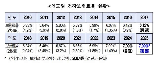이날 건정심에서는 2025년도 건강보험료율을 올해와 동일한 7.09%로 결정했다. 이는 2009년, 2017년, 올해에 이어 역대 4번째 보험료율 동결이며, 2년 연속 보험료율 동결은 이번이 처음이다.