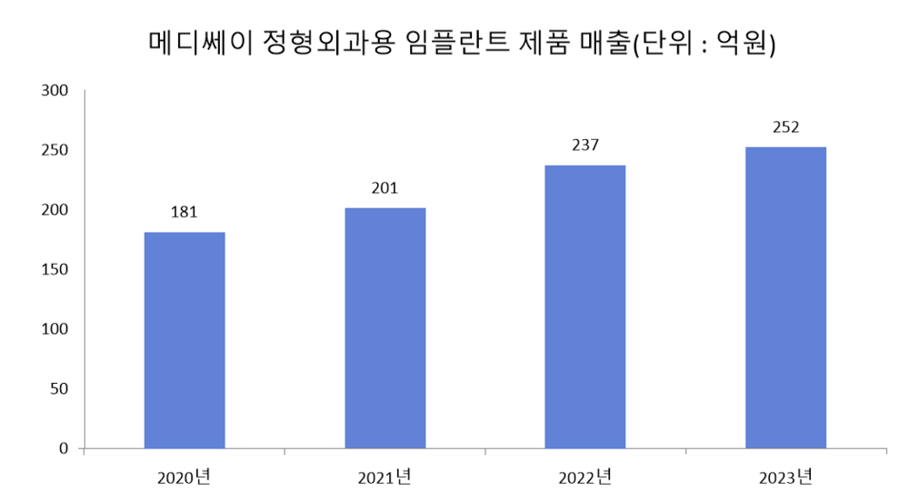 연도별로 구분 시, 2021년 메디쎄이 정형외과용 임플란트 제품 매출은 201억원으로, 전년 대비 11.1% 늘었다. 2022년과 지난해 정형외과용 임플란트 제품 매출은 전년 대비 18.1%, 6.3% 증가한 237억원, 252억원으로 집계됐다.