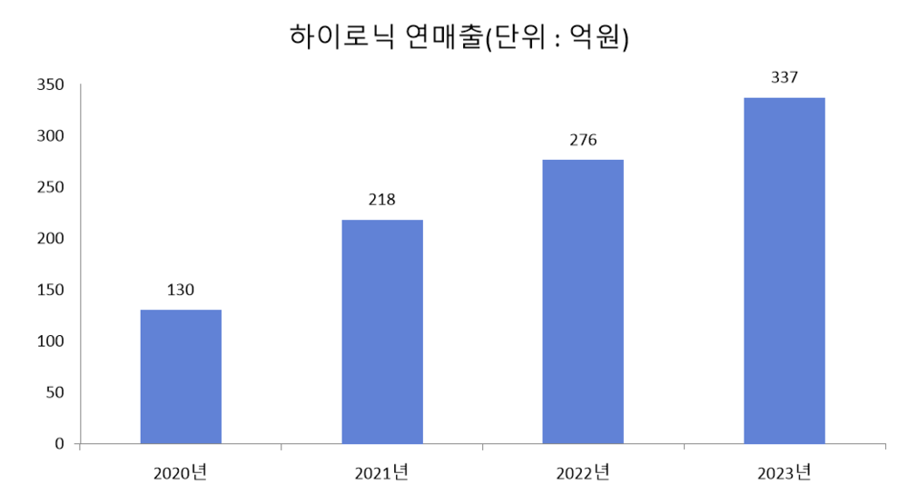 하이로닉은 공시 자료에서 2021년과 2022년에 매출 218억원, 276억원을 기록했다며, 전년 동기 대비 67.7%, 26.6% 늘었다고 밝혔다. 지난해 하이로닉 매출은 전년 같은 기간과 비교해 22.4% 증가한 337억원으로 집계됐다.