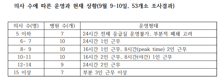 7개 병원은 응급실 근무 의사가 5명 이하로 부분적 폐쇄를 고려해야 하는 수준이었고, 24시간 동안 1인이 근무(6~7명)하는 병원이 10개소였다. 총 17개(32.1%) 병원은 1명이 근무할 수밖에 없는 의사 수만 확보한 상태였다. 부분 2인 근무(8-11명)는 20개소(37.7%)였고, 의사가 12명 이상으로 2인 이상이 항상 근무할 수 있는 병원은 16개소(30.2%)였다.