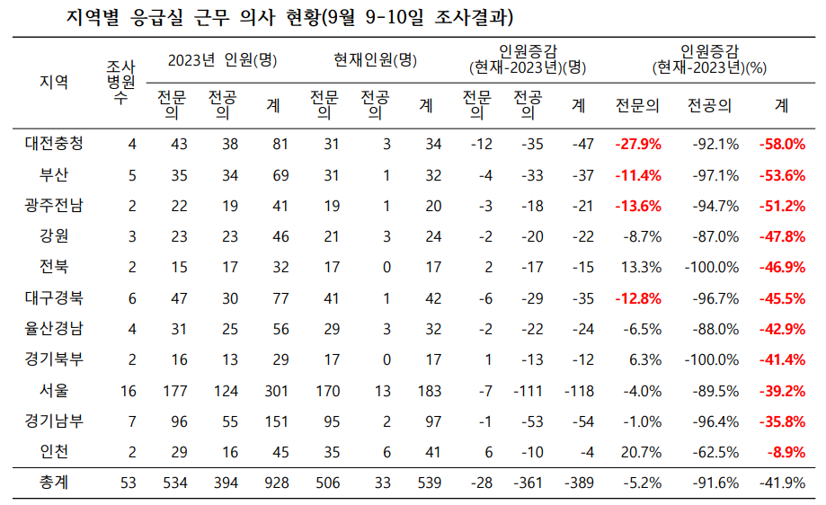 이 조사 결과에 따르면, 전체 응급실 근무 의사 수는 922명에서 534명으로 388명(42.1%) 감소했다. 전문의의 수가 감소한 병원은 29개소(54.7%), 변화가 없는 병원은 12개소, 늘어난 병원은 12개소였다. 전공의(일반의)의 수는 총 384명에서 33명(91.4%)으로 감소했다.