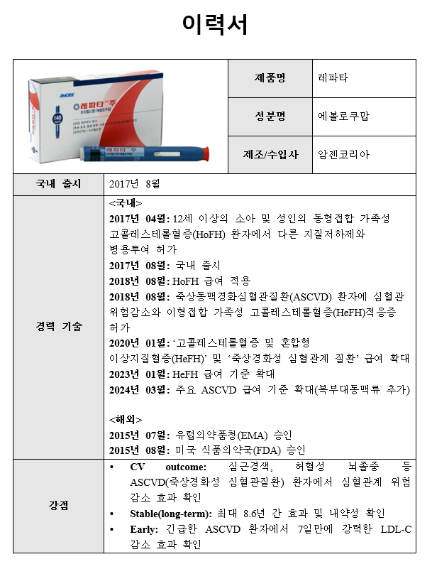 [메디파나뉴스 = 최성훈 기자] 안녕하세요. 저는 암젠코리아 '레파타(에볼로쿠맙)'입니다. 저는 이상지질혈증 치료에서 2015년 '구원투수'로 등장했죠. PCSK9 억제제로서 스타틴 최대 용량에도 저밀도 지단백 콜레스테롤(LDL-C) 강하에 실패한 환자들에게 필수 옵션으로 자리 잡았기 때문인데요.