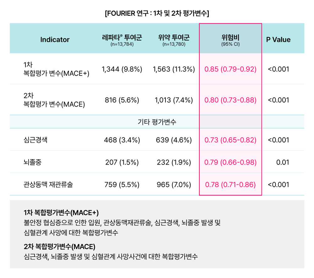 FOURIER 연구에서 레파타 투여군은 협심증으로 인한 입원, 관상동맥 재관류술, 심근경색, 뇌졸중 발생 및 심혈관계 사망 등을 놓고 본 1차 복합평가변수에서 위약군 대비 그 위험도를 15% 감소시켰습니다.