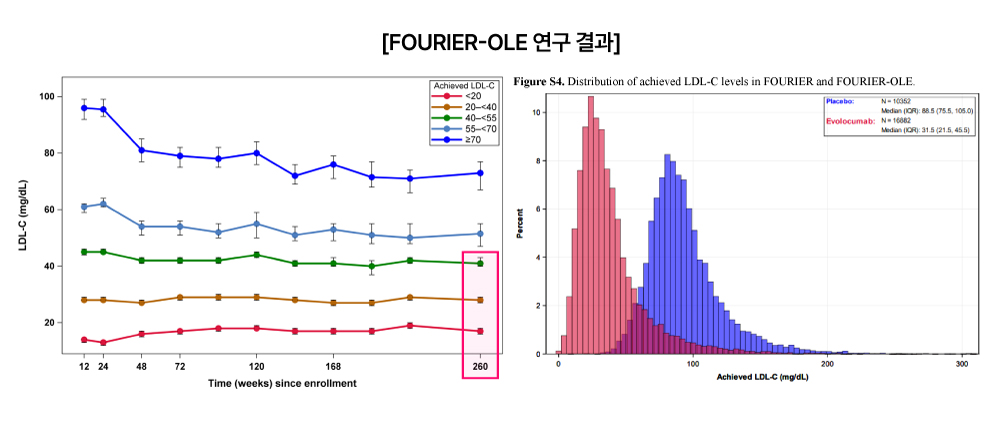실제 FOURIER-OLE 연구의 1차 평가변수는 약물 투여 이후 발생한 이상반응이었고, 2차 평가변수는 FOURIER 연구의 기저치 대비 LDL-C 백분율 변화와 정기 내원 시의 LDL-C 수치 40 mg/dL 미만 달성률이었습니다.