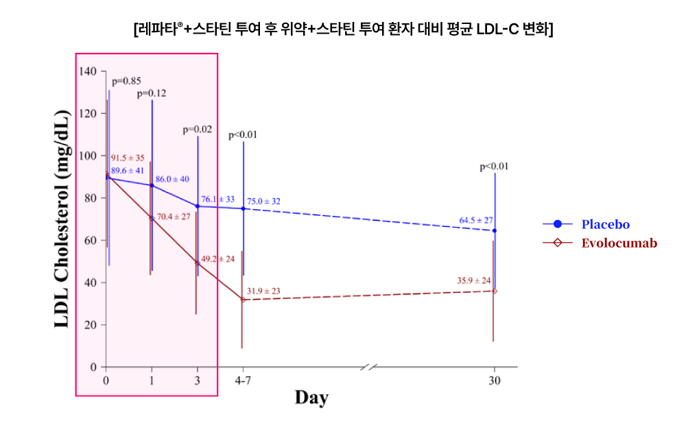 특히 저를 통해서 환자는 투여 하루 만에 LDL-C 수치가 70.4±27mg/dL까지 감소됐으며, 3일 차부터는 49.2±24mg/dL로 위약군 대비 현저히 감소되는 효과가 나타났습니다.