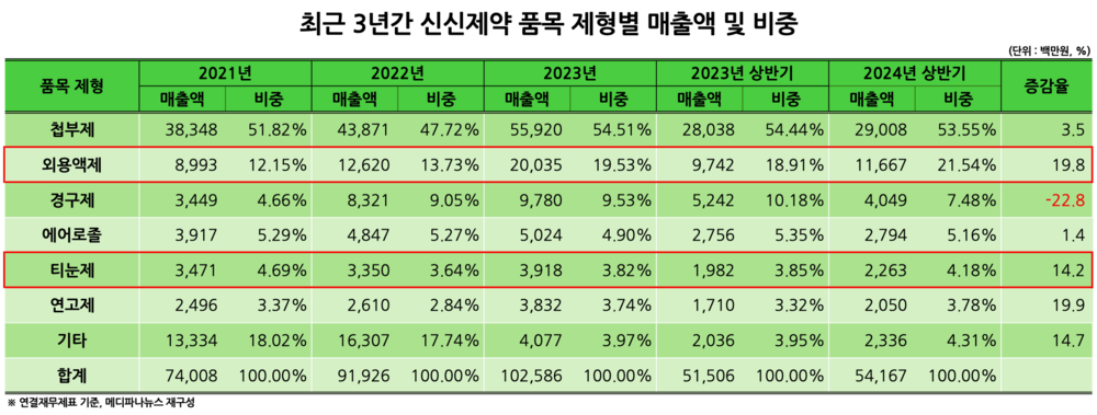 매출이 꾸준히 증가함에도 불구하고 비중이 감소하거나 크게 증가하지 못한 것은 회사의 새로운 성장동력인 '외용액제'와 '티눈제' 매출 성장과 무관하지 않다.