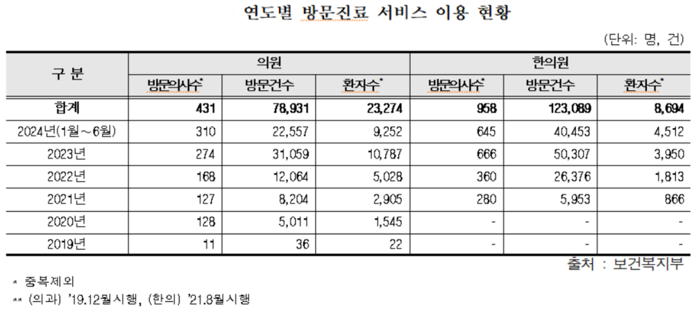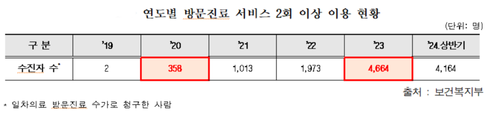 시범사업을 시작한 이래 현재까지 연도별로 방문진료 서비스를 2회 이상 이용한 현황은 2020년 358명에서 2023년에는 4664명으로 급증했다. 그러나 2023년 기준 방문진료 서비스 총 환자수 1만4737명(의원 10,787명, 한의원 3950명) 대비로는 31.6%로 10명 중 3명만이 방문진료 서비스를 이용하고 있었다.