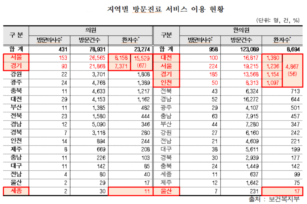 ◆ 방문진료 서비스 이용, 서울·경기지역 67%로 가장 높아