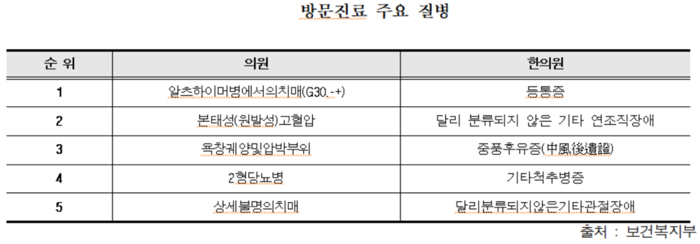 주요 질병으로 의원에서는 알츠하이머병에서의 치매, 본태성(원발성) 고혈압, 욕창궤양 및 압박 부위 순이었으며, 한의원에서는 등통증과 달리 분류되지 않은 기타 연조직 장애, 중풍 후유증 순으로 방문진료를 이용하는 것으로 나타났다.