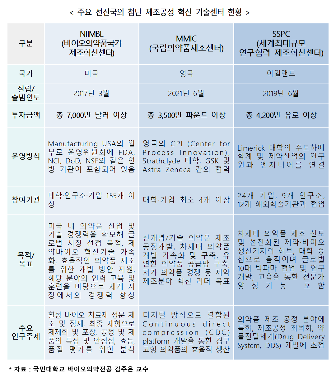 미국, 영국, 아일랜드 등 제약바이오 선진국들은 생산성 향상을 위해 NIIMBL, MMIC, SSPC 등 제조혁신센터를 마련해 제조혁신 및 공정혁신 기술 확보를 위한 중장기 정책을 수립하고, 지능형 제조혁신기술 확보를 통한 경제적 이익 실현을 위해 정부차원에서 선제적으로 지원하고 있다.