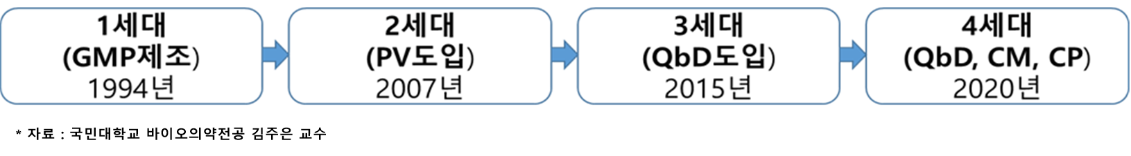 이후 차세대 제조혁신으로 알려진 4세대(차세대 QbD, CP&CM)부터는 1, 2, 3세대를 모두 포함하며 추가적으로 제조혁신 기술로 거론되는 연속공정의 적용을 통해 QbD와 연계된 제조혁신 시대로 진입하고 있다.