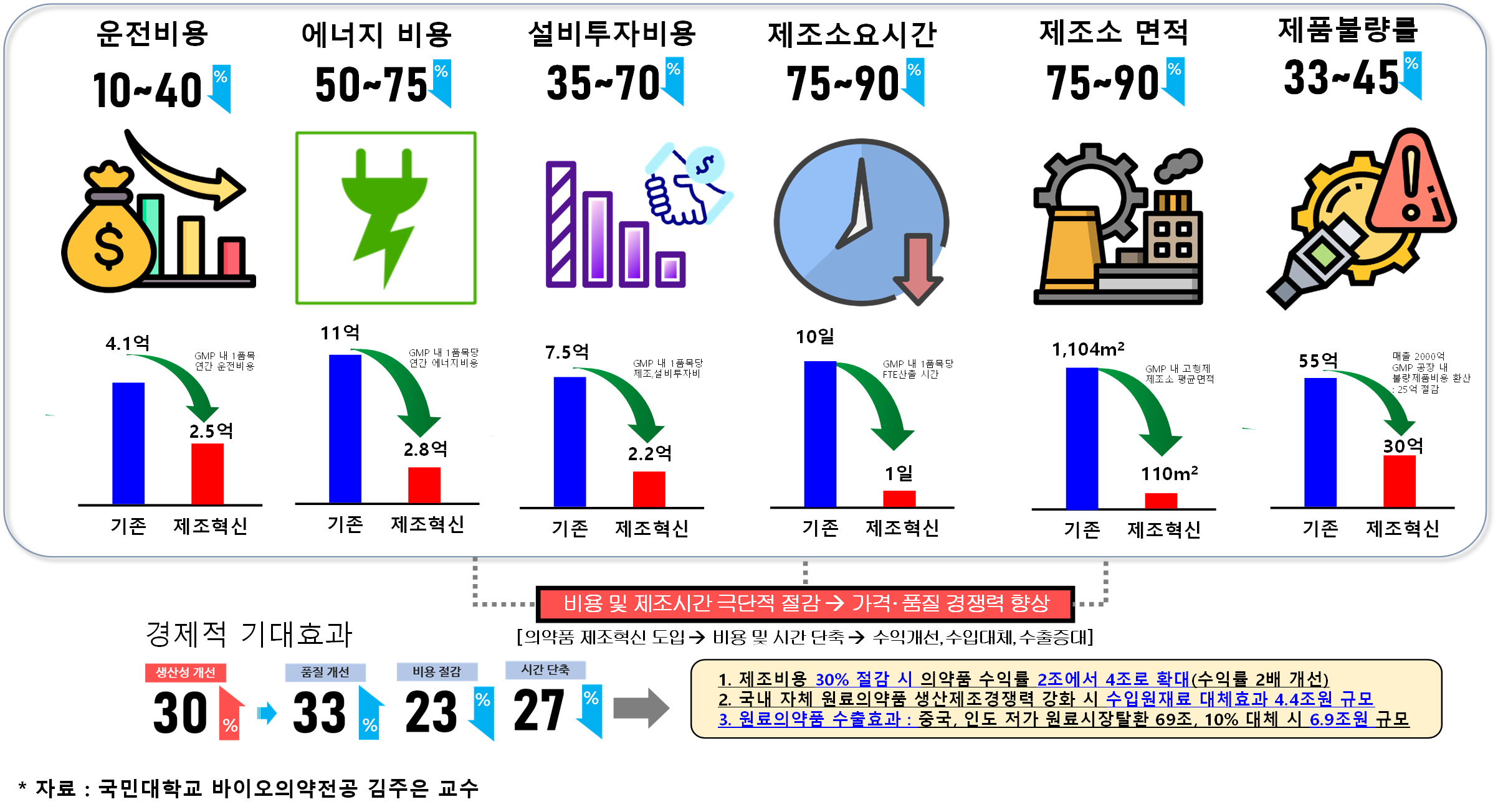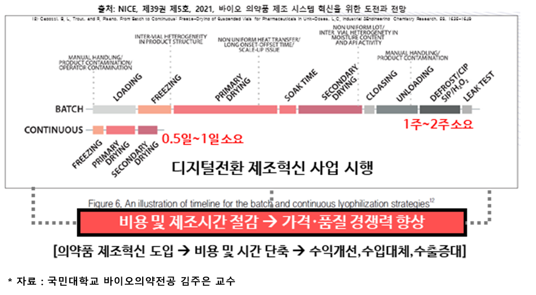 이를 극복하기 위해 디지털전환 의약품 제조혁신, 공정혁신 등의 첨단 제조혁신 기술개발이 완성된다면, 제약바이오산업의 가격 및 품질경쟁력이 크게 상승해 신약개발 시간 및 생산비용 단축, 글로벌 경쟁력 강화, 의약품 산업 관련 전후방 산업 발전, 고용 창출 효과까지 기대할 수 있을 것이다.