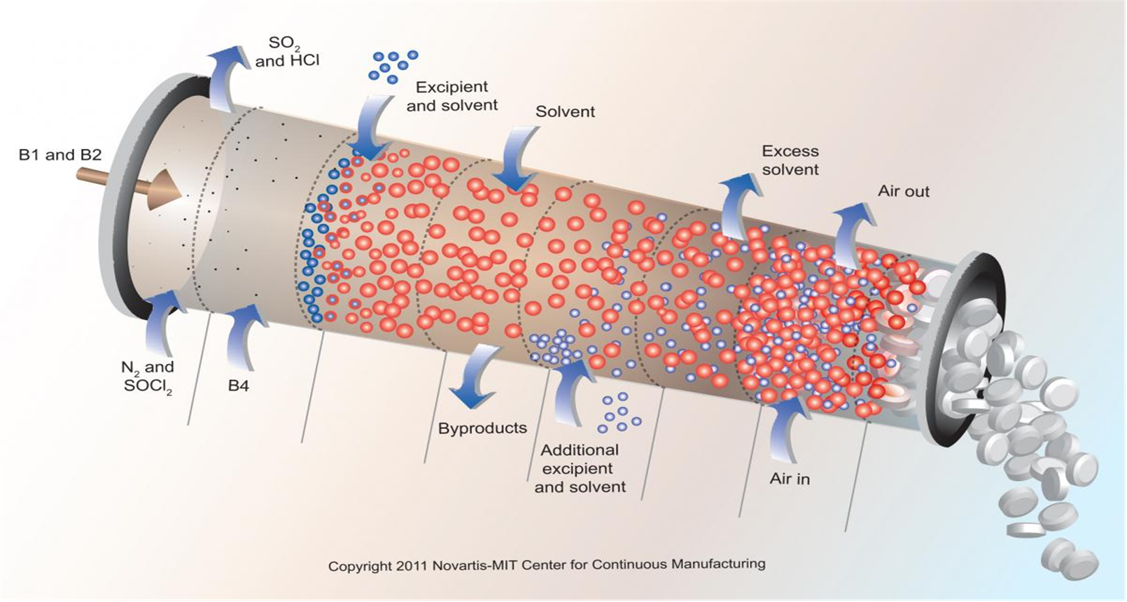 MIT에서 연속공정 변경에 필요한 기초기술을 선행연구 한 후, 이를 기반으로 Novartis에서 자사의 의약품을 이용해 시생산 규모에 적용시키는 연구를 수행 중인 것으로 알려져 있다.