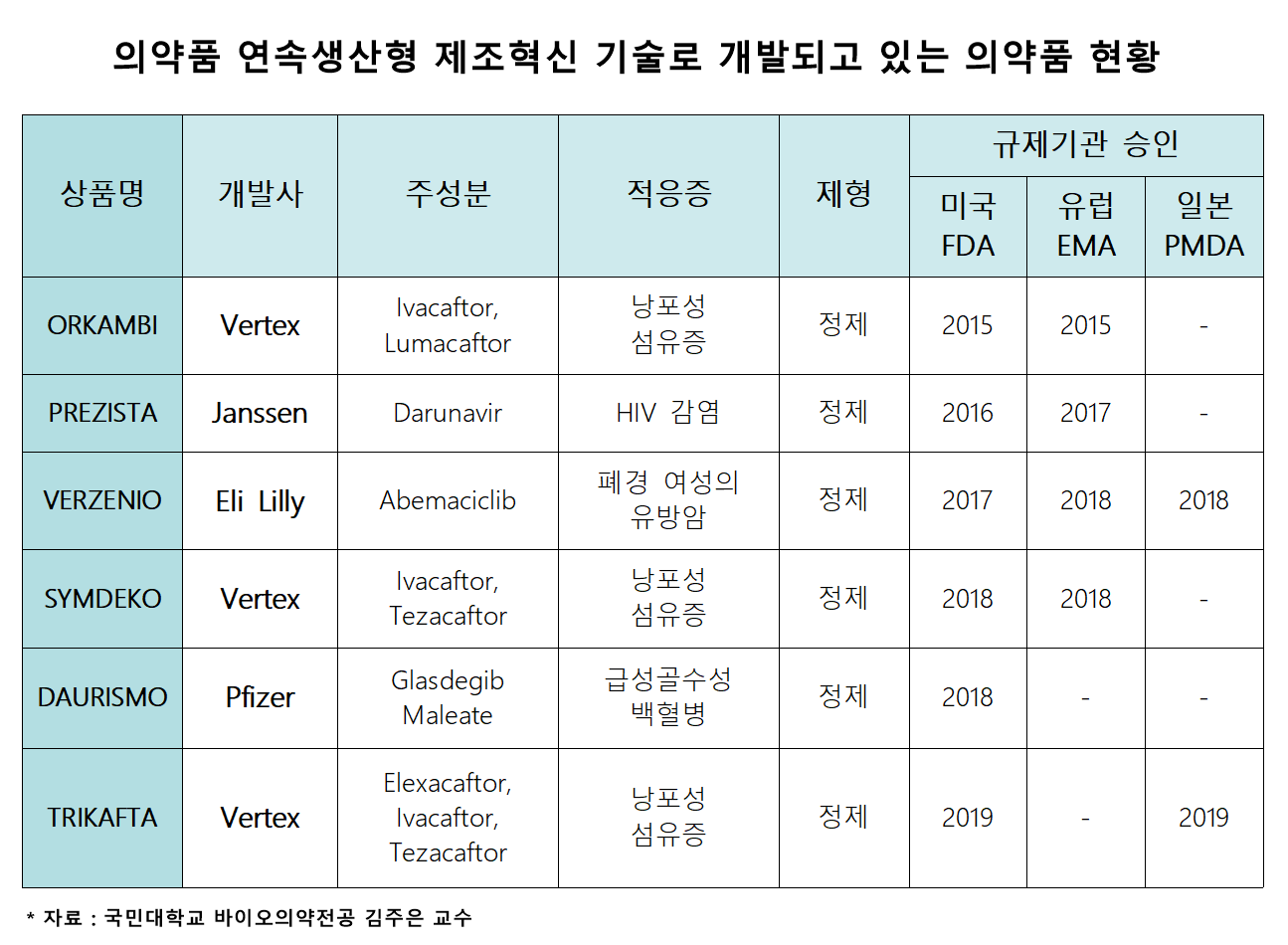 이 제조혁신 기술을 테스트하는데 최대 5000만 달러를 투자했으며, 현재 사용되는 규모와 비교해 1/9의 공간으로 의약품의 생산이 가능하다고 보고하고 있다. 연속공정을 통한 의약품의 생산은 제조시간, 공정시간, 비용, 탄소 배출의 양과 속도를 줄일 수 있으며, 원자재 사용 및 폐기물의 감소로 수율을 개선하고 에너지 비용을 절감할 수 있음을 보고했다.