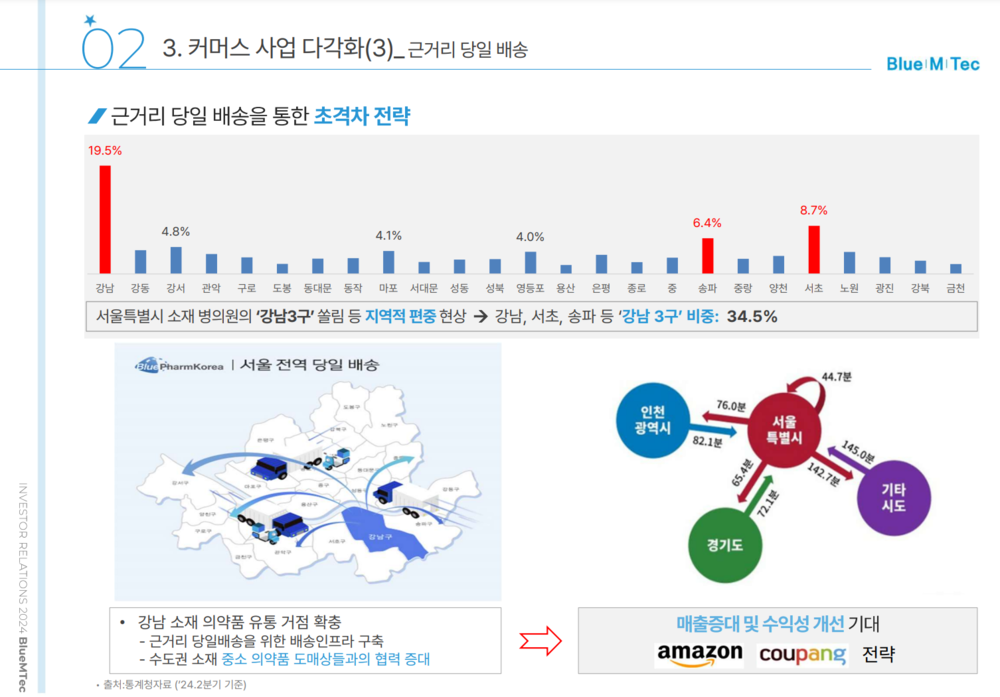 서울시 소재 병의원이 강남, 서초, 송파 등 '강남3구'(34.5%)에 쏠려있는 지역적 편중 현상을 활용, 강남 소재 의약품 유통 거점을 확충하고, 근거리 당일배송 인프라 구축 및 수도권 소재 중소 의약품 도매상들과의 협력을 증대해 매출 증대 및 수익성을 개선한다는 방침이다.