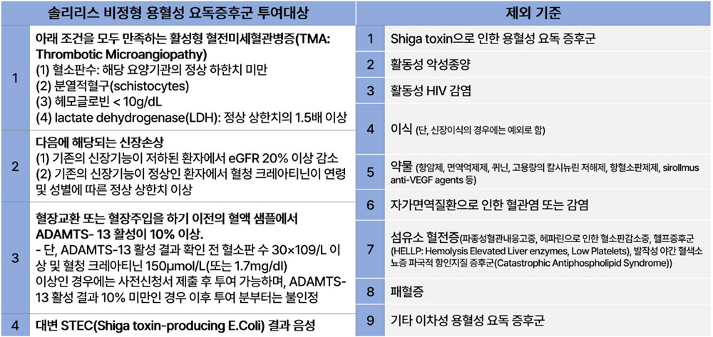 또 솔리리스 급여 조건 역시 너무 까다롭다는 지적이다. aHUS 환자가 솔리리스 급여 치료를 받기 위해서는 8가지의 혈액학적 조건과 신장 손상 등의 조건을 모두 충족하면서, 9가지의 제외 기준에 단 1가지도 해당돼서는 안 된다. 해외 aHUS 급여 기준과 비교해도 매우 까다로운 편이다.
