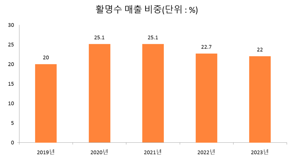 메디파나뉴스가 이 회사 사업보고서를 분석한 결과, 활명수 매출 비중은 최근 5년간 동화약품 매출에서 20%를 상회했다. 일례로 지난해 활명수 매출 비중은 약 22%로, 비중이 두 번째로 높은 품목보다 7.8%p 높았다.
