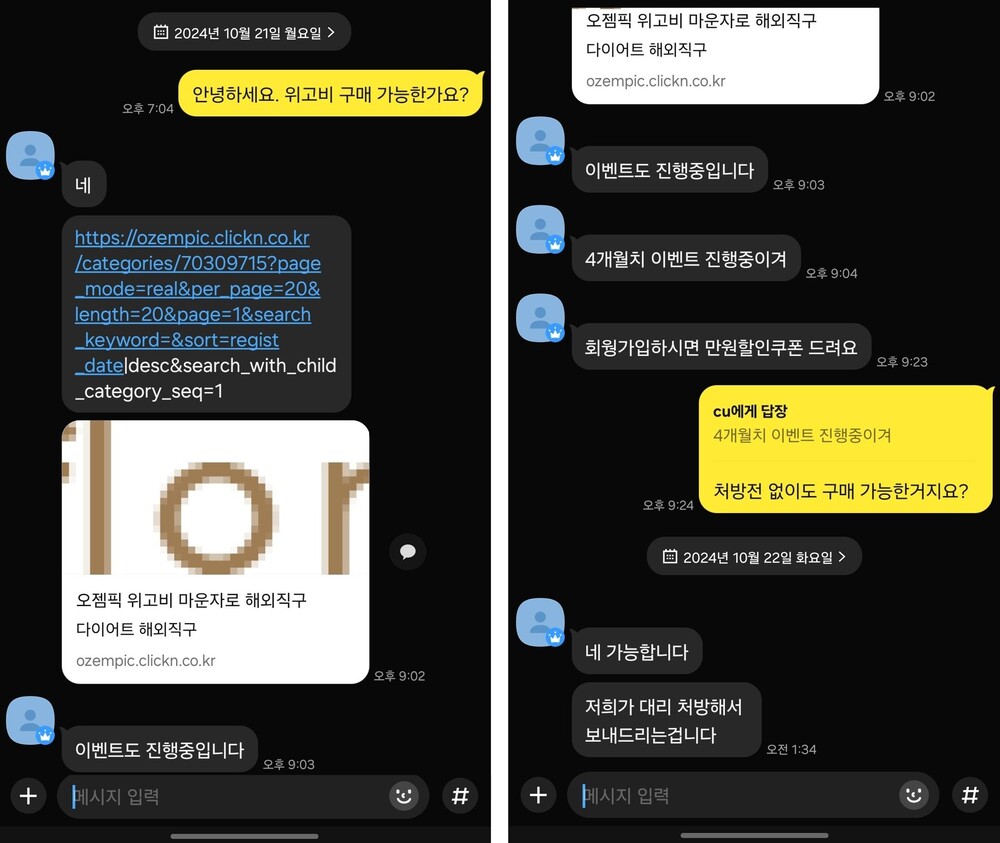 장 의원은 "해당 사이트에 접속해보니, 각기 다른 용량의 위고비는 물론 국내에 아직 출시되지 않은 '마운자로'와 같은 다이어트 의약품도 판매되고 있었다"며 "실제 판매자에게 메신저로 구매 가능 여부를 물었더니 4개월치 이벤트도 진행 중이라며 회원 가입을 유도했다"고 설명했다. 또한 "처방전 없이도 구매가 가능하냐는 질문에 대리 처방해서 보내드리기 때문에 가능하다는 답변이 돌아왔다"고 말했다.