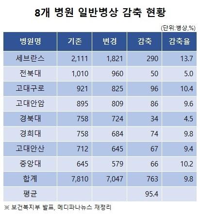 복지부에 따르면, 이들 8개 병원에서 추진되는 일반병상 감축 규모는 총 763병상이다. 평균으로는 95.4병상이다.