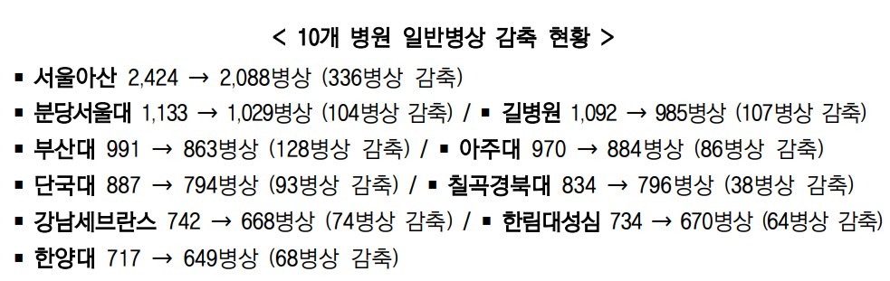 분당서울대병원과 길병원, 부산대병원 등은 100병상 이상을 감축하고, 단국대병원과 아주대병원은 80병상 이상을 줄인다.