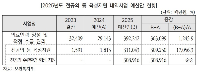 그러면서, 장기간에 걸쳐 지속되고 있는 의정 갈등 영향으로 인해 전공의 복귀 및 수련 참여가 불확실한 상황에 예산안이 편성된만큼 사업 계획의 추진가능성과 사업예산 규모의 적정성에 대한 면밀한 검토가 필요하다고 했다.