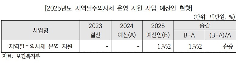 의료개혁 관련 2025년도 신규 사업으로 추진될 '지역필수의사제 운영 지원 사업' 예산으로는 13억5200만원으로 책정됐다. 지역의료를 살리기 위한 정주 인력을 확보하기 위해 마련된 사업임에도 적은 예산규모로 인해 기존 공중보건장학제도처럼 참여율이 저조할 것이라는 시각이 나온다.