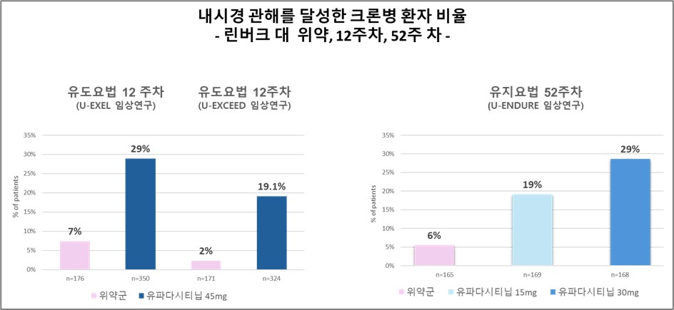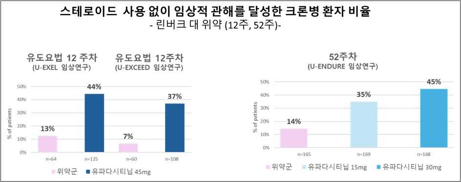 크론병 치료에서도 마찬가지로 52주차에 린버크 15mg과 30mg으로 치료받은 환자 35%와 45%가 코르티코스테로이드 없이 임상적 관해를 달성한 것으로 나타났습니다.3