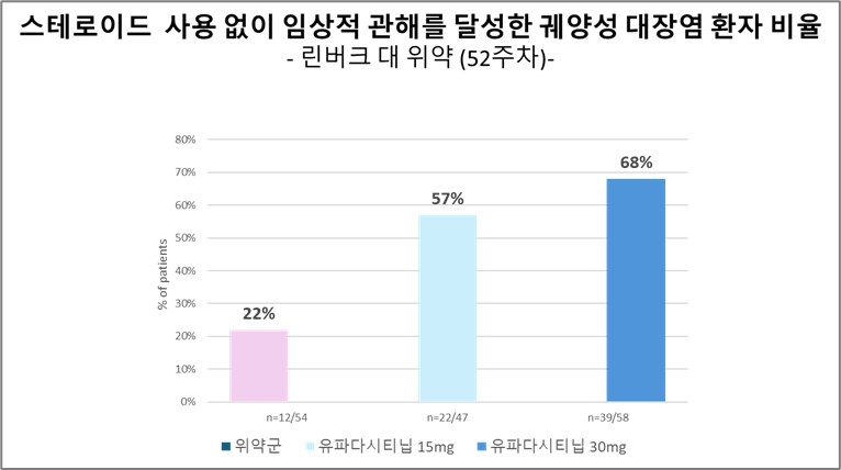 저의 임상연구에 기반해 살펴보면, 궤양성대장염 치료에서 52주차에 린버크 15mg과 30mg으로 치료받은 환자 57%와 68%가 코르티코스테로이드 없이 임상적 관해에 도달했습니다.