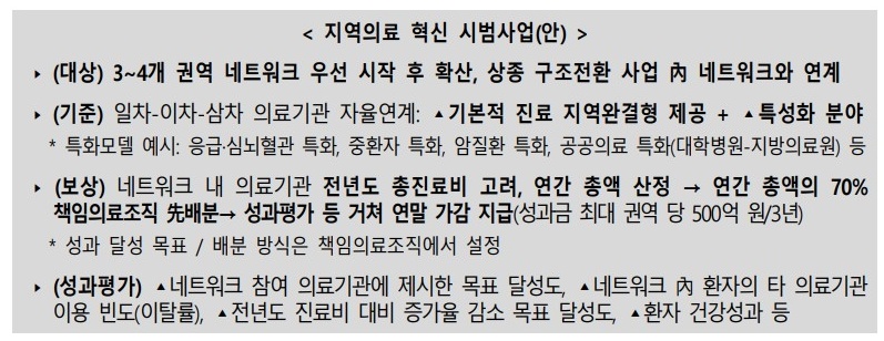 1차 실행방안에 따르면, 지역의료 혁신 시범사업은 중증·응급·희귀 질환 중심 상급종합병원 구조전환 사업과 연계되는 사업이다. 또 2차 의료기관간 협력네트워크가 중요한 부분이기도 하다. 아울러, 행위별 수가제를 벗어나 환자 경험, 치료결과 등 성과와 연계해 책임의료조직에 비용을 보상하는 방식의 시범사업으로 3년간 권역 당 최대 500억원의 보상을 추진한다.