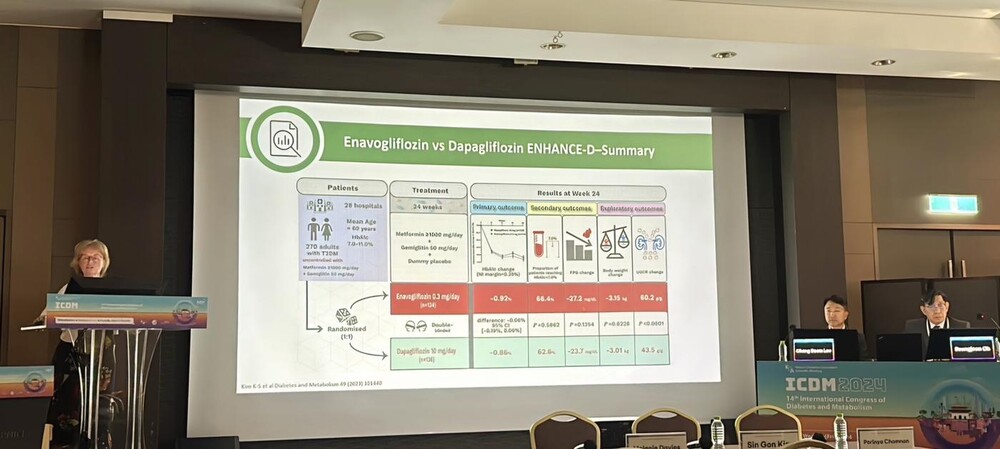 첫 번째 연자로 나선 데이비스 교수는 세션을 통해 2형 당뇨병 환자를 대상으로 진행된 3건의 임상 3상 연구에서 엔블로가 복용 전보다 현저한 혈당 강하 효과를 나타냈으며, 체중, 혈압, 인슐린 저항성 등에서도 유의미한 개선을 보였다고 소개했다.