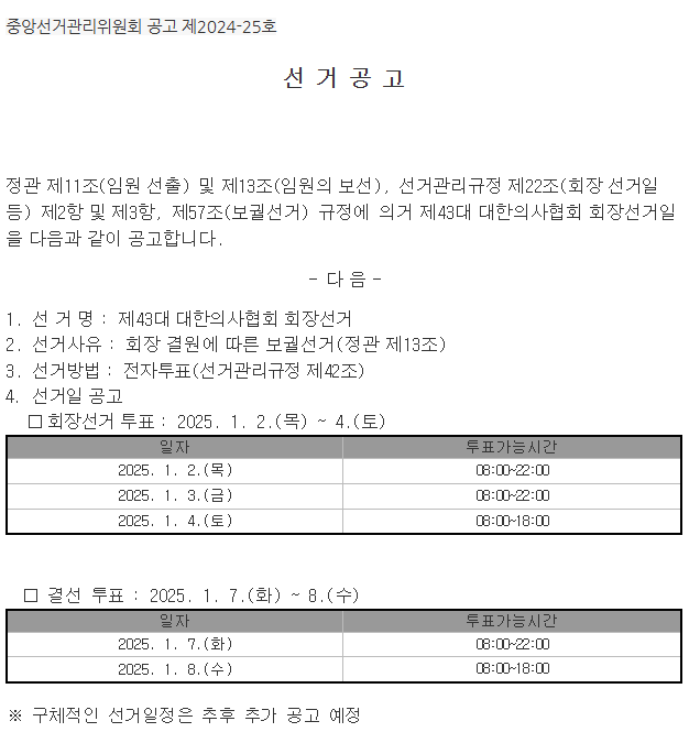 의협 중앙선거관리위원회는 지난 12일 43대 의협 회장 선거일을 공고했다.
