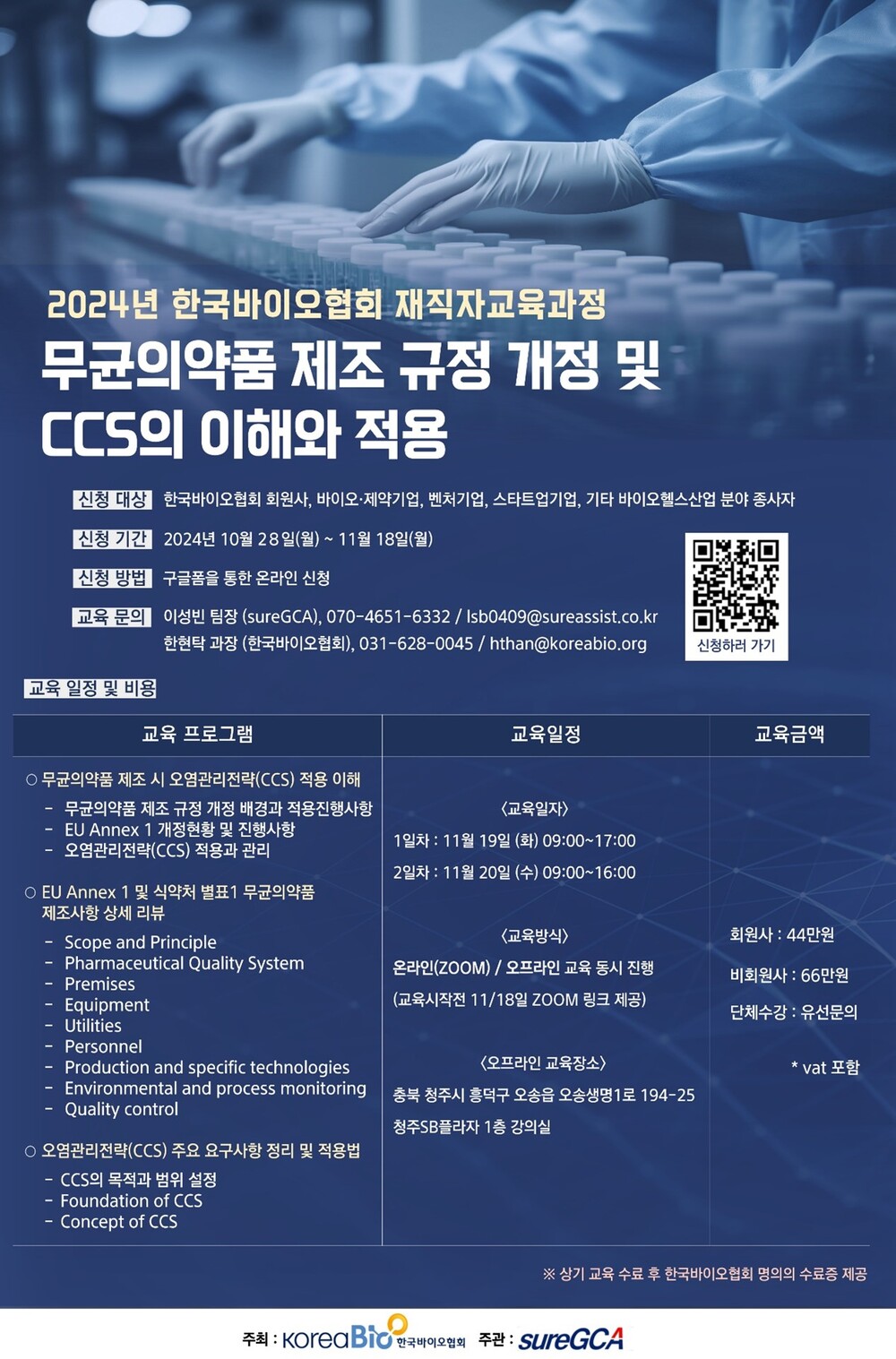 본 교육 세부사항 및 신청방법은 한국바이오협회 홈페이지 공지사항 내 '무균의약품 제조 규정 개정 및 CCS의 이해와 적용 재직자 교육' 모집 공고에서 확인 가능하다.