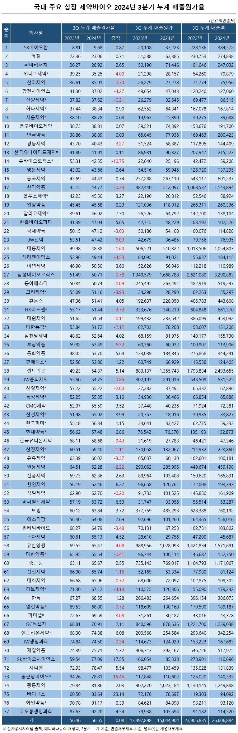 매출 최상위권 업체 중에서는 한미약품, 대웅제약이 각각 44.77%, 48.38%로 비교적 낮은 매출원가율을 나타냈다. 삼성바이오로직스와 동아에스티 등도 매출원가율 50% 수준으로 비교적 낮았다.