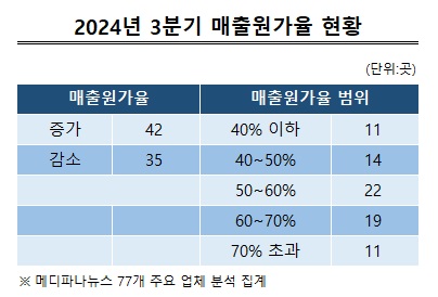 이는 지난해 3분기 누계 매출원가율 56.46% 대비 0.08%p(포인트) 높아진 수준이다. 올해 상반기 56.57%보다는 0.02%p 낮아졌다.