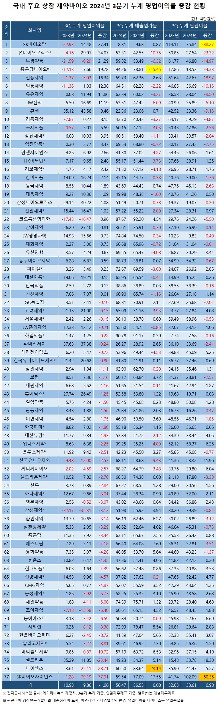이는 18일 메디파나뉴스가 77개 상장(코스피·코스닥) 제약·바이오 업체 연결·개별 재무제표 기준 올해 3분기 보고서를 분석해 영업이익률 증감 현황을 집계한 결과다.