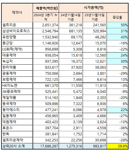 19일 나우팜컨설팅이 집계한 '상장제약 283사 올해 3분기 누적 매출 및 시가총액' 자료에 따르면, 매출 상위 10개 제약바이오사 중에 지난 1년 동안 시가총액이 증가한 기업은 6개사였다. 평균 증가율은 32%를 기록했다.