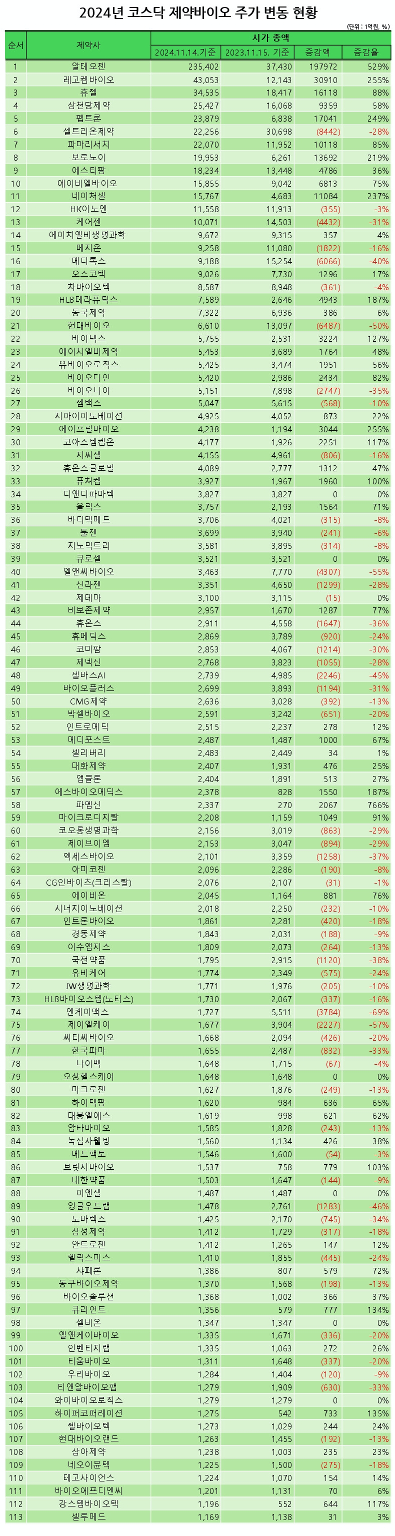 업체별 시가총액을 살펴보면, 11월 14일 종가 기준 ▲알테오젠(23조5402억원) ▲레고켐바이오(4조3053억원) ▲휴젤(3조4535억원) ▲삼천당제약(2조5427억원) ▲펩트론(2조3879억원) ▲셀트리온제약(2조2256억원) ▲파마리서치(2조2070억원) ▲보로노이(1조9953억원) ▲에스티팜(1조8234억원) ▲에이비엘바이오(1조5855억원) 등이 각각 1위부터 10위에 이름을 올렸다. 아울러 ▲네이처셀(1조5767억원) ▲HK이노엔(1조1558억원) ▲케어젠(1조71억원)이 각각 시가총액 1조원 이상을 기록했다.
