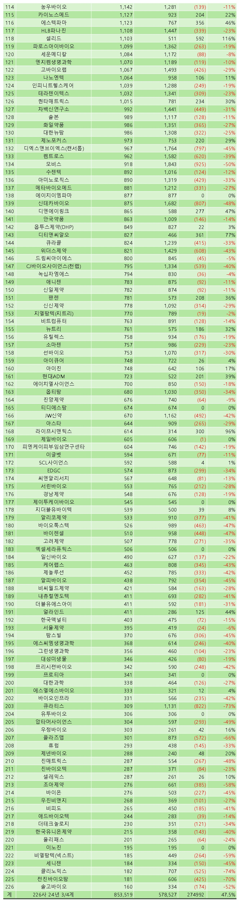 감소율 순으로 살펴보면 ▲클리노믹스가 -74%로 가장 큰 감소율을 기록했으며 ▲큐라티스(-73%) ▲전진바이오팜(-70%) ▲엔케이맥스(-69%) ▲플라즈맵(-66%) 등이 그 뒤를 이었다.