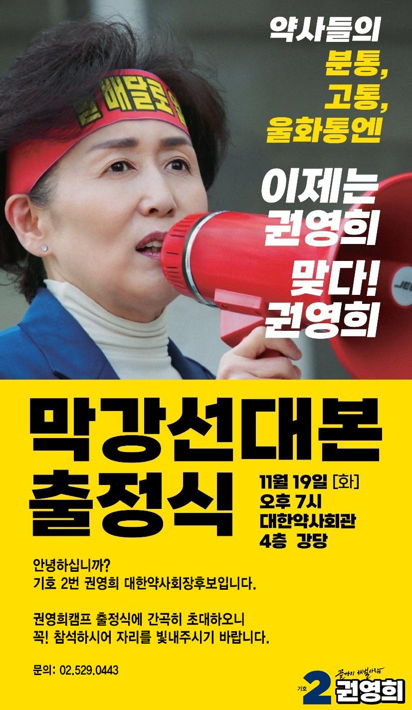 권 후보는 "복지부와 의협이 반대해도 절대 회원들의 고충을 외면해서는 안 된다. 물러서거나 양보해서도 안 된다. 국민보건과 약권수호를 위한 일에 타협은 있을 수 없다"며 "회원들은 최광훈 대한약사회 집행부의 느리고 답답한 회무에 지쳤다. 이제는 바꿔야 할 때다"라고 열변했다.