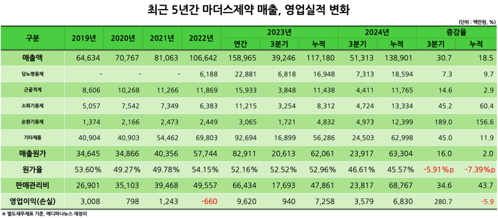 마더스제약은 매출 성장에 더해 매출원가율을 낮추며 실적도 개선했다. 회사 분기보고서에 따르면 올해 3분기 원가율은 46.61%로 전년 동기 52.52% 대비 5.91%p 감소했다. 3분기 누적 매출원가율은 45.57%로 전년 동기 52.96% 대비 7.39%p 낮아졌다.