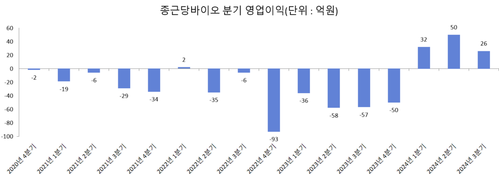 22일 금융감독원 전자공시시스템 자료에 따르면, 종근당바이오가 분기 영업이익 흑자를 올해 3분기까지 이어갔다. 이 회사 3분기 영업이익은 26억원으로, 전년 동기 영업손실 57억원 대비 흑자 전환했다.